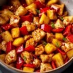 - Add the solids: Toss in the cubed chicken, chopped red bell pepper, and fresh pineapple pieces. Mix thoroughly so every chunk is generously coated—this promises juicy bites filled with sauce and pineapple sweetness.